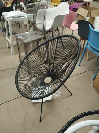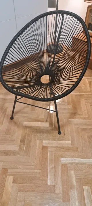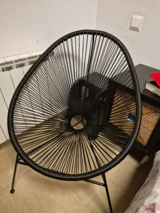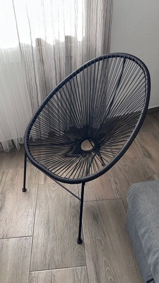 Vendo silla tipo Acapulco en color negro, ideal para terraza, jardín, balcón o interior. Muy cómoda y decorativa, estilo moderno/minimalista. ✅ Estructura metálica resistente ✅ Asiento de cuerda/plástico trenzado ✅ Muy ligera y estable ✅ Perfecta para exterior e interior