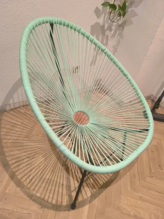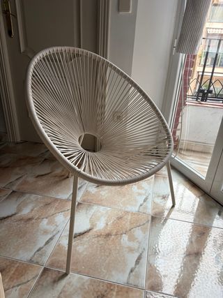 Silla estilo Acapulco, moderna y muy decorativa. Estructura resistente con asiento de cuerda sintética trenzada, cómoda y ligera. Ideal para salón, terraza, balcón o dormitorio. - Color: beige / blanco roto - Material: estructura metálica y cuerda sintética - Estilo: moderno / boho / minimalista - Estado: muy buen estado, sin roturas ni desperfectos visibles - Uso interior o exterior cubierto Entrega en mano, recogida en Retiro (Madrid).