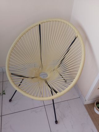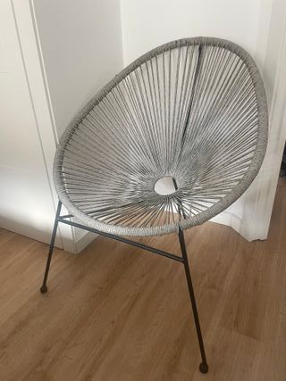 Silla Acapulco de Leroy Merlin. Diseño moderno y envolvente. Perfecta para darle un toque precioso a tu jardín, terraza o incluso salón. NUNCA SE HA USADO. NUNCA HA ESTADO EN EL EXTERIOR. Ha estado siempre en interior. La compré para decorar una esquina de la casa pero finalmente le di otro uso al espacio y la silla estuvo guardada todo el tiempo. Es muy bonita y cómoda, y con un cojín beige queda genial, pero vivo en un piso muy pequeño y no tengo sitio. - Estructura de acero resistente. - Asiento tejido con cuerdas de mimbre sintético en color beige. - Tratamiento anticorrosivo integrado - Soporta hasta 160 Kg