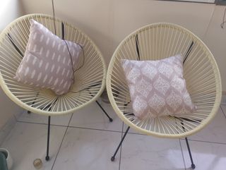 Conjunto de dos sillas de diseño Acapulco, perfectas para tu terraza o balcón. Su estructura metálica y asiento tejido aportan un toque moderno. - Diseño icónico Acapulco. - Estructura de metal resistente. - Asiento tejido con cordón.