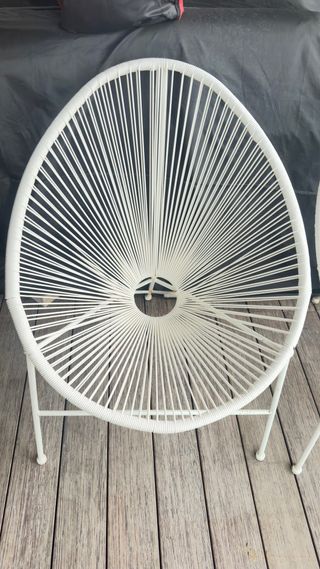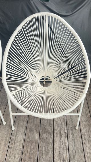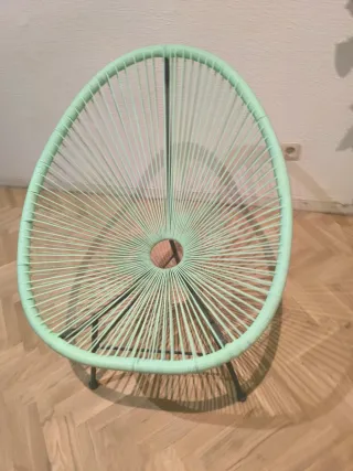 Conjunto de dos sillas estilo Acapulco con un diseño moderno y cómodo. - Estructura de metal resistente. - Asiento tejido con cuerdas de plastico. una de ellas tiene una cuerda suelta (ver ultima foto). Se puede arreglar facilmente, hay videos en youtube enseñando hacerlo. Solo vendo el par. Las dos por 30€. Nuevas 160 €. A recoger en Barcelona (no envio).