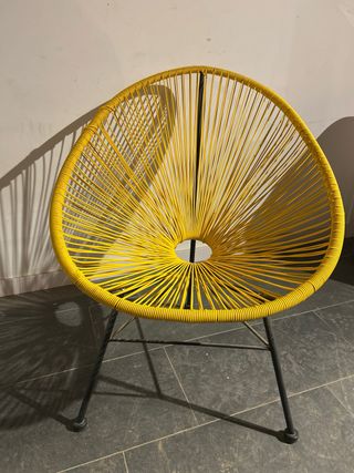 Silla de diseño Acapulco con una estructura llamativa. El precio es por q tiene una tira rota esta agarrada y no afecta en nada - Marco exterior tejido. - Patas metálicas negras.