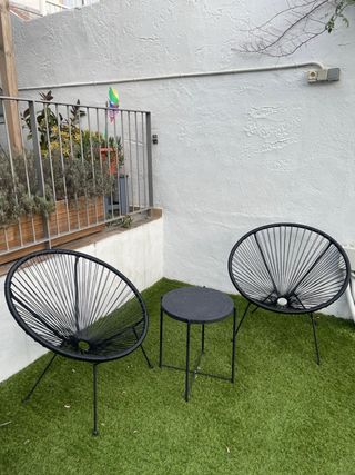 Conjunto de dos sillas estilo Acapulco y una mesa auxiliar a juego. El diseño moderno y los materiales resistentes los hacen perfectos para cualquier espacio. - Dos sillas de diseño. - Una mesa auxiliar redonda. - Estructura metálica. - Asientos y tablero de plástico tejido - Ideal decoración jardín / terraza /