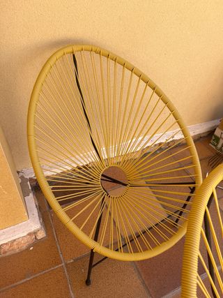 Para recoger en Córdoba, Andalucía!! Conjunto de dos sillas estilo Acapulco, perfectas para terraza o jardín. La cuerda que las rodea está bastante estropeada por el sol pero la estructura se encuentra en perfecto estado - Estructura de metal resistente. - Asiento tejido con cuerdas de plástico. 10€ la unidad