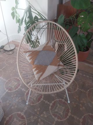 Silla estilo Acapulco, moderna y muy decorativa. Estructura resistente con asiento de cuerda sintética trenzada, cómoda y ligera. Ideal para salón, terraza, balcón o dormitorio. - Color: beige / blanco roto - Material: estructura metálica y cuerda sintética - Estilo: moderno / boho / minimalista - Estado: muy buen estado, sin roturas ni desperfectos visibles - Uso interior o exterior cubierto Entrega en mano, recogida en Retiro (Madrid).