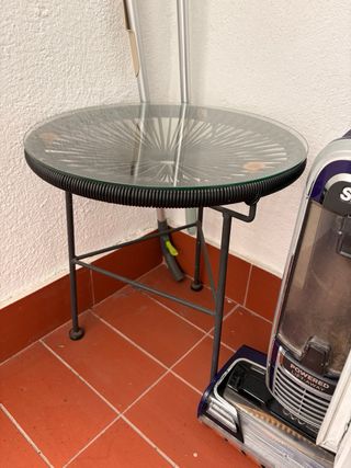 Están nuevas, no se han usado. Conjunto de dos sillas estilo Acapulco y una mesa baja redonda con tapa de cristal. Perfectas para tu terraza o balcón. - Diseño moderno y cómodo. - Estructura de metal negro. - Tapa de mesa de cristal.