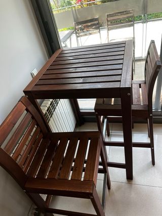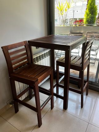 Dos sillas y mesa altas. En muy buen estado y cuidado. La mesa solo tiene una pequeña marca que se visualiza en una punta de la misma. Medidas: Sillas 91 alto x 45 ancho Mesa 102 alto x 60 ancho ( se puede bajar hasta 72 cm). Ver en imagenes