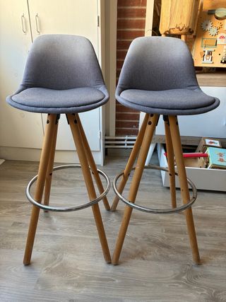 Conjunto de dos sillas altas con un diseño moderno y cómodo. - Asiento tapizado en tela gris. - Patas de madera robusta. - Aro metálico reposapiés. no hemos utilizado mucho pero el color ha cambiado arriba por el sol. Nuevo son 120€