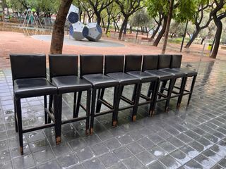 Conjunto de ocho sillas altas de estilo pub, perfectas para barras o mesas altas. Su diseño elegante y robusto las hace ideales para cualquier espacio. - Tapicería de cuero. - Estructura de madera. - Altura de taburete de bar.