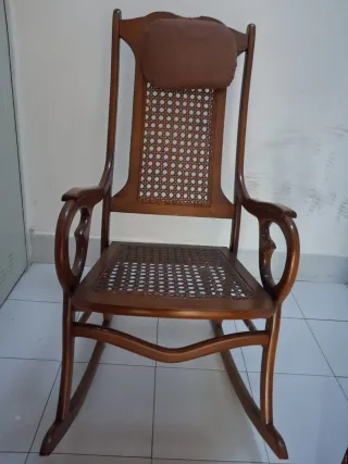 Elegante silla mecedora de madera con detalles en rattan. Un mueble clásico que aporta calidez a cualquier espacio. - Estructura de madera robusta. - Asiento y respaldo con tejido de rattan. - Diseño curvo y ergonómico.