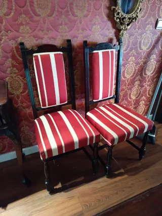 Conjunto de dos sillas antiguas con un diseño clásico y elegante. Perfectas para añadir un toque de distinción a cualquier espacio...25 euros las dos - Tapicería de tela a rayas rojas y blancas. - Estructura de madera oscura. - Patas talladas con detalle.