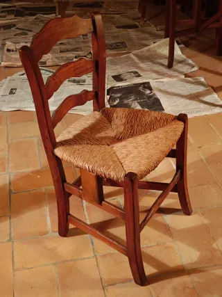 Silla antigua de madera con asiento de yute.