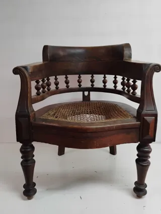 Pieza de mobiliario antigua con un diseño único y artesanal. Necesita limpieza Se envía desmontada - Elaborada en madera. - Acabado en color negro y detalles en marrón. - Presenta un tallado intrincado en el respaldo y el asiento. - Estructura robusta con tres patas.