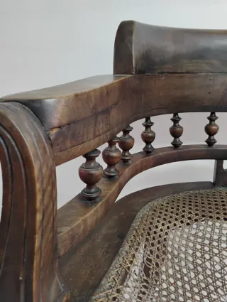 Elegante silla antigua con un diseño curvado y detalles en rattan. - Estructura principal de madera. - Asiento con tejido de rattan. - Patas torneadas.