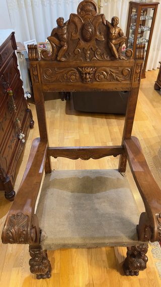 Silla antigua de gran valor decorativo y artesanal, fabricada en madera maciza de nogal, reconocida por su durabilidad, calidad y elegante veta natural. Destaca por su impresionante respaldo alto con elaborados motivos ornamentales y figuras talladas a mano, así como por sus patas robustas con detalles escultóricos. Se trata de una pieza única, con gran presencia, ideal para decoración de interiores con carácter (estilo clásico, rústico o vintage) o para coleccionistas. ✔ Restaurada recientemente ✔ Tratamiento completo de la madera (limpieza, protección y acabado) ✔ Estructura sólida y estable ✔ Madera noble (nogal macizo) ✔ Pieza