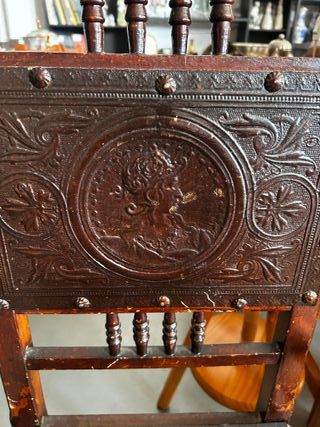 Preciosa pareja de sillas de estilo neorrenacentista. Lo más destacado es su tapicería original de cartón piedra endurecido y repujado, con una ornamentación clásica preciosa. Perfectas para dar un toque de personalidad a un rincón de la casa, una tienda o un estudio fotográfico. Estructura de madera maciza muy robusta con patas torneadas. El cartón piedra conserva bien sus relieves ornamentales (medallón central con busto y motivos florales). Presentan el desgaste lógico de su antigüedad, lo que les aporta una pátina auténtica. Detalles: Clavos de latón originales y madera trabajada.