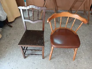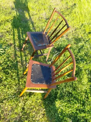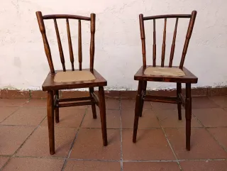 Conjunto de dos sillas antiguas de madera que han sido restauradas. Perfectas para dar un toque clásico a tu hogar. - Estructura de madera robusta. - Diseño tradicional con respaldo de varillas. - Asientos restaurados. 20 euros las 2 sillas No hago envíos. Solo en León, España