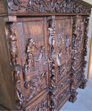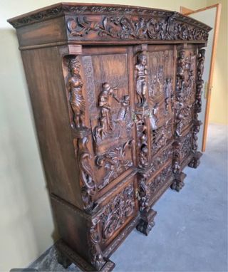Conjunto de muebles antiguos de madera tallada, ideal para recibidor o salón. Se escuchan ofertas - Armario con elaborados detalles tallados. - Mesa a juego. - Seis sillas antiguas a juego con el conjunto.