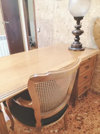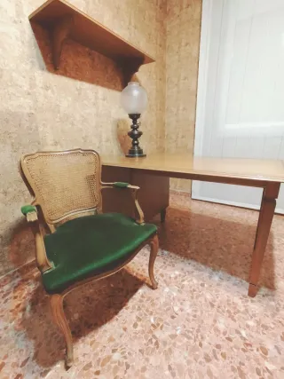 Conjunto de escritorio de madera con una silla de terciopelo. - Silla con asiento y respaldo tapizados. - Patas de madera con diseño curvo. - Escritorio con superficie lisa y patas de madera. Cajonera con 4 cajones. - Lampara antigua