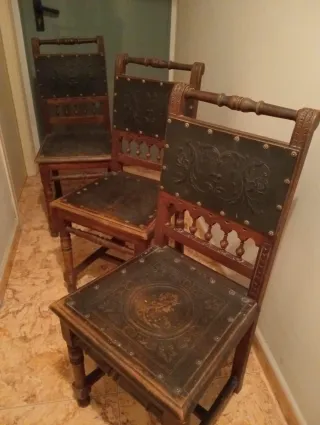 Conjunto de tres sillas antiguas con un diseño clásico y elegante. Cada pieza combina la calidez de la madera con el detalle del cuero repujado. - Asientos y respaldos de cuero con motivos decorativos. - Estructura de madera robusta. - Detalles ornamentales en la madera.