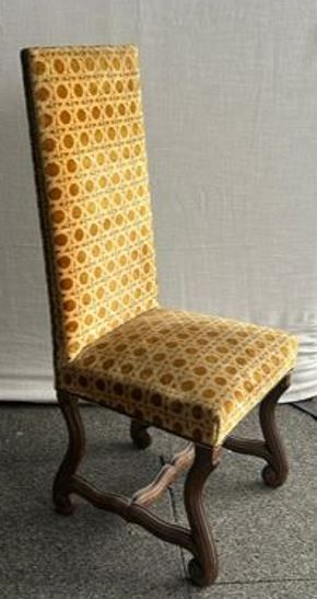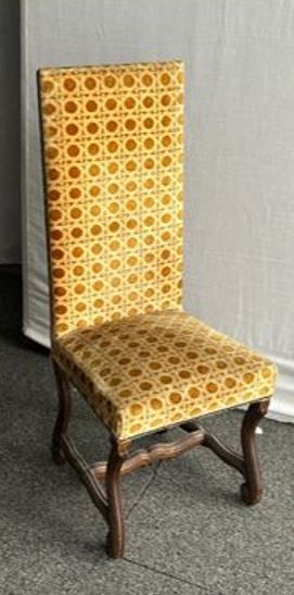 Elegante silla clásica con estructura de madera maciza y tapizado. - Diseño de respaldo alto con detalles. - Acolchado confortable. - Acabado en tela de damasco.