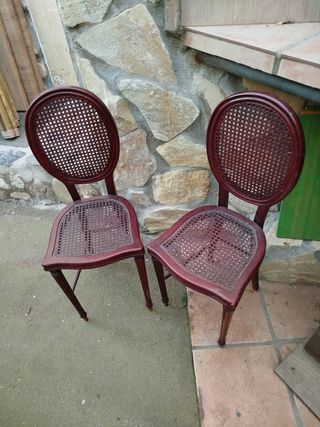 Par de sillas antiguas con un diseño clásico y elegante. Las sillas tienen un tamaño reducido, son más pequeñas de lo normal. - Estructura de madera. - Asiento y respaldo de ratán. Medidas : 30x30 asiento, el respaldo 35x30 y la altura de asiento 43
