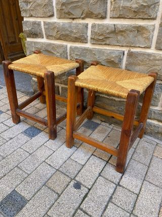 Conjunto de tres banquetas antiguas con un diseño rústico y natural. Precio de las 3: 85€ - Estructura de madera robusta de pino macizo. - Asiento tejido con enea de manera artesana. Hago envios o entrego en mano en Zaragoza y Huesca.
