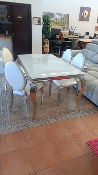 detalles: Medida: 160x90x75cm Colores: Blanco/negro PRECIOS Solo la mesa 269€ SILLAS 399€ pack de 4 sillas 599€ pack de 6 sillas mesa barroca mesa gitana mesa vanguardia mesa moderna sillas gitanas mesa plateadas