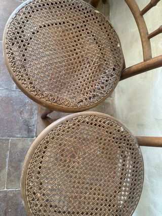 Silla Bistrot negra y asiento de rejilla color negro Están enteras pero para darles una mano pintura Tengo 8 unidades Precio individual 10€ Precio de las 8 sillas 50€