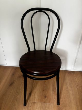 Conjunto de 15 sillas(20€/und. negociable) estilo bistrót con estructura de hierro y asiento de madera de nogal. - Diseño elegante y atemporal. - Patas de hierro negro. - Asiento redondo de madera de nogal.