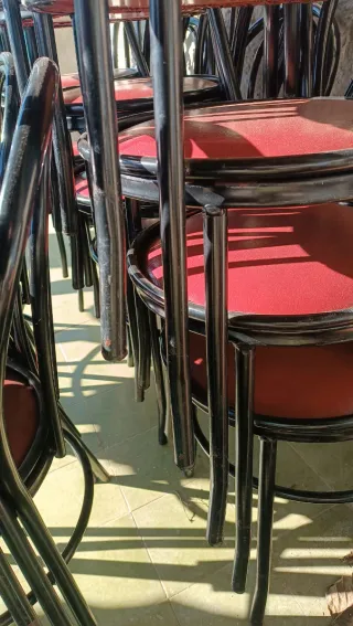 Se venden veinte sillas de bar de estilo bistrot. Son de metal, con estructura negra y asiento rojo. Están en buen estado. - Ideales para bares o restaurantes. - Diseño clásico y elegante. - Fáciles de limpiar.