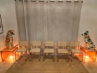 Sillas de diseño vintage inspiradas en el icónico modelo Cesca B32 del movimiento Bauhaus. Estructura en madera con acabado haya natural y asiento y respaldo de rejilla de viena (ratán) artesanal, bien tensada y en muy buen estado. Ideales para proyectos de interiorismo contemporáneo, aportando calidez y carácter sin recargar el ambiente. Se conservan en muy buen estado general. Pedido mínimo 2 unidades por 300 euros. Dispongo de 8 unidades. Se entregan en mano en Madrid.