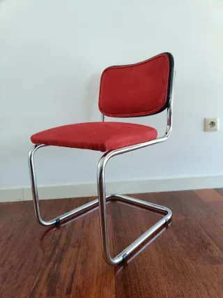 Silla de diseño estilo cesca con un acabado en cuero sintético rojo y estructura metálica. - Diseño cantilever o cesca. - Brazos y patas cromadas. - La parte de abajo se puede retapizar por 50/70€ según tapicero. *Precio negociable.