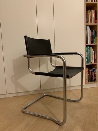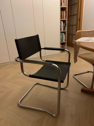 *Precio por unidad, 3 DISPONIBLES* 3 sillas estilo Thonet S34, diseño de Mart Stam. Fabricadas en los años 90, con estructura tubular cromada y asiento y respaldo en cuero negro. Se encuentran en buen estado general, con el cromado en muy buen estado. La tapicería presenta ligeros signos de uso y del paso del tiempo propios de su antigüedad, que no afectan a su uso ni a su estética. tags: silla chair cadires sillón butaca space age mid century vintage antigua retro oficina años 60 70 80 design diseño kartell danes aparador escandinavo cassina miguel mila santa cole enetri ikea wassily guzzini artemide togo bauhaus b&b cesca