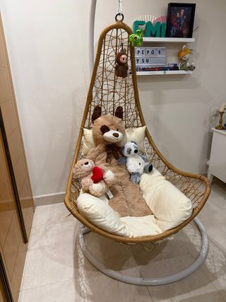 Cómoda silla colgante para niños, ideal para dormir, leer o jugar. Cuenta con un cojín blando integrado y acolchado extraíble. Lleva tiempo guardada y nunca se usó. Tiene cremallera para poder sacar el cojín y poder lavarlo. Carga máxima: 80 kg.