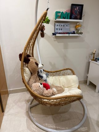 Cómoda silla colgante con un diseño moderno. - Estructura de metal resistente. - Cojín suave en tono beige. Tiene algunos desperfectos por el uso, pero no molesta su uso diario, tiene pequeño descocido en la tela pero se puede reparar y algunos hilos sueltos, mirar las fotos .