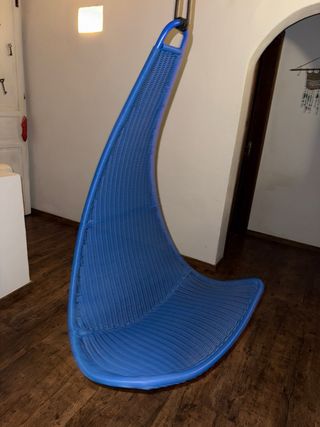 Silla colgante de diseño moderno y llamativo. - Material: Plástico y mimbre. - Color: Azul.