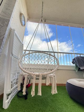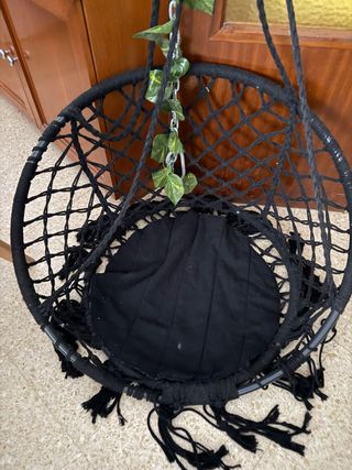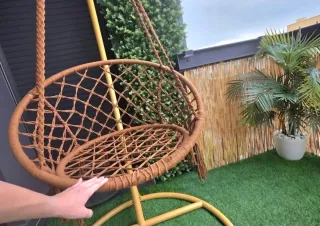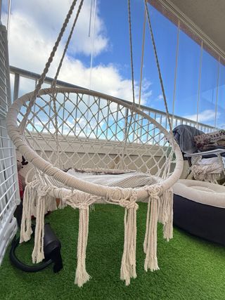 Vendo silla colgante de estilo bohemio en color crudo, incluye el soporte metálico. Está en excelente estado, ideal para darle un toque especial a tu terraza, balcón o salón. • Comodidad total: Perfecta para leer o relajarse. • Sin instalaciones: Al llevar soporte propio, no tienes que agujerear el techo. • Estética: Tejido de macramé resistente con flecos decorativos. No hago envíos por el volumen del soporte, solo recogida en persona.