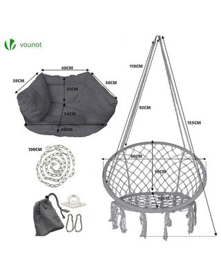 - VOUNOT Silla Colgante Exterior con Flecos, Hamaca con Conjines y Kit de Suspensión Ø80cm Silla Columpio para Interior y Exterior, Gris (no incluye los tornillos para instalar) -Material Poliéster Color Gris Marca VOUNOT Dimensiones del producto 100l. x 50an. centímetros Recomendación de peso máximonu 120 Kilogramos Peso del producto 4,3 Kilogramos