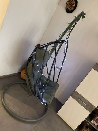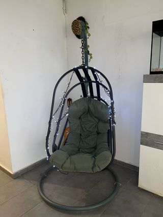 Preciosa silla colgante ideal para relajarse. Tiene un diseño elegante y moderno. - Estructura metálica negra resistente. - Cojín cómodo y mullido de color verde. - Incluye luces LED para crear un ambiente acogedor. - Perfecta para interiores y exteriores. de puede nivelar la altura al gusto peso maximo 220KL
