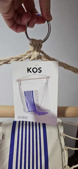 Silla colgante con un diseño moderno y cómodo. - Estructura de madera. - Asiento de tela con rayas azules. - Cuerdas de yute para colgar. Como se puede ver no se ha usado nunca