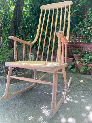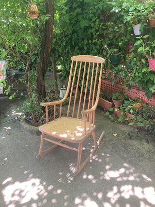 Preciosa silla mecedora de estilo colonial Vintage. Se encuentra en buen estado. Es una silla de madera de cerezo lijada y asiento de mimbre recién restaurado. Ideal para terrazas o jardines grandes No es posible rebajar el precio dado que ha sido el coste de retaurar toda la silla, incluido la rejilla de mimbre. ❤️