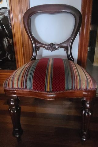 4 Sillas y 2 sillones o sillas con reposabrazos recién restauradas. Madera y tela de buena calidad. El reverso del acolchado no se ha cerrado con otra tela, por lo que se puede ver el remate, y lo enseño en las fotos.