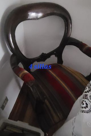 Lote de 4 sillas antiguas de madera maciza, con respaldo curvado y patas torneadas, una llevan reposabrazos y otra no. Tapizado en tonos burdeos y rayas, en buen estado. Estilo clásico/vintage. 📍 Solo recogida en Bilbao (País Vasco) ❌ No se envían - Estructura de madera oscura. - Asiento y respaldo tapizados con tela de rayas y detalles en terciopelo. - Patas torneadas de madera.