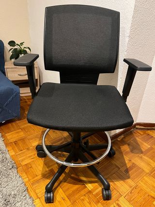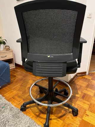 Silla de oficina con respaldo de malla y asiento acolchado. No tiene ningún golpe, esta como nueva - Respaldo de malla transpirable. - Asiento de tela. - Base con ruedas para fácil movilidad. - Reposabrazos. - Aro reposapiés metálico. Altura mínima: 56cm Altura máxima: 84cm
