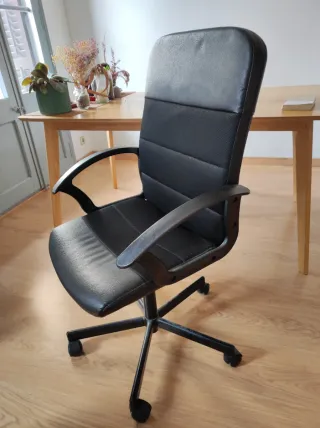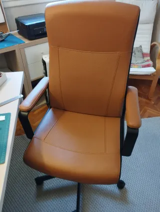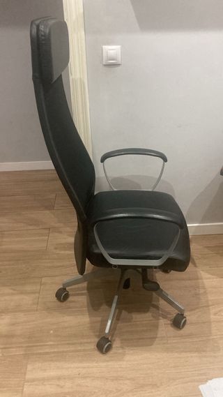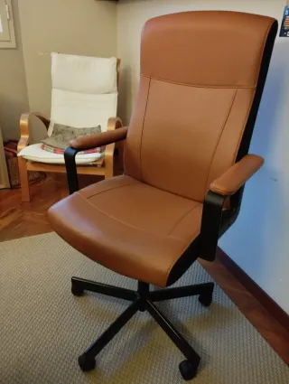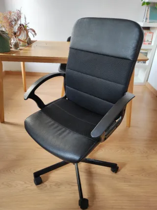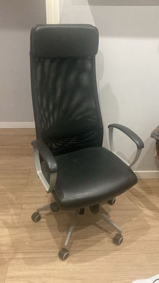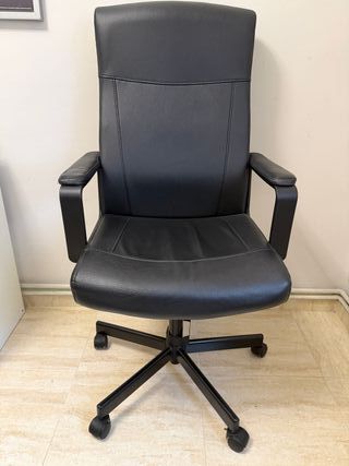 Silla de escritorio con un diseño moderno y ergonómico. - Tapicería de piel sintética. - Base de metal con ruedas. - Reposabrazos acolchados. Modelo MILLBERGET de IKEA. Usado por 1 año