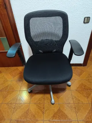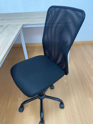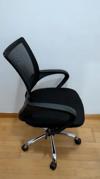 Vendo silla de escritorio giratoria en color negro. Es muy cómoda, ligera e ideal para jornadas de teletrabajo o estudio. Está en muy buen estado y funciona todo perfectamente (ruedas y elevación). Características y materiales: *Respaldo: Fabricado en malla transpirable, ideal para no pasar calor en verano o durante largas horas de uso. Incluye una pieza de refuerzo en la zona lumbar. *Asiento: Acolchado cómodo y tapizado en tela negra resistente al roce. *Reposabrazos: Fijos, de plástico rígido negro con diseño curvo para mayor comodidad. *Base: Elegante base de estrella metálica con acabado cromado