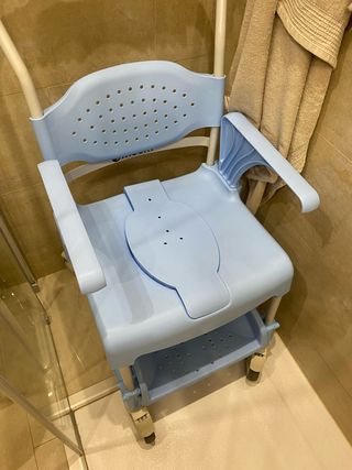 Silla de ducha de plástico, color azul. - Asiento con respaldo. - Reposabrazos. - Ruedas para facilitar el desplazamiento.