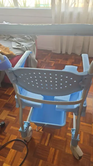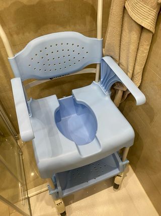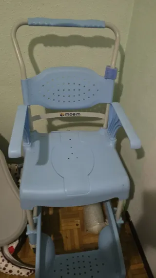 Silla de ducha Moem en color azul, nunca utilizada. - Asiento con perforaciones para el drenaje del agua. - Reposabrazos para mayor comodidad y seguridad. - Estructura de metal resistente.