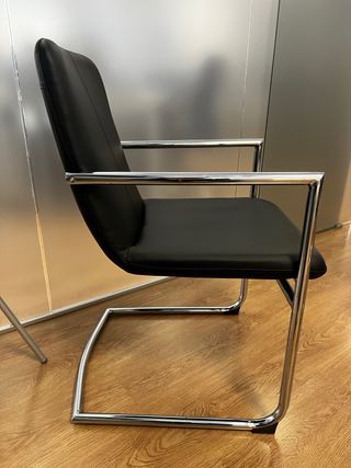 Silla de diseño moderno, ideal para oficinas o salas de conferencias. Su estructura metálica le confiere gran estabilidad. Estructura metálica cromada muy resistente Reposabrazos acolchados Asiento tapizado en tela negra Respaldo ergonómico de diseño moderno Muy cómoda y estable Ideal para despacho, sala de reuniones, academia o estudio en casa. Se puede ver y recoger sin compromiso.